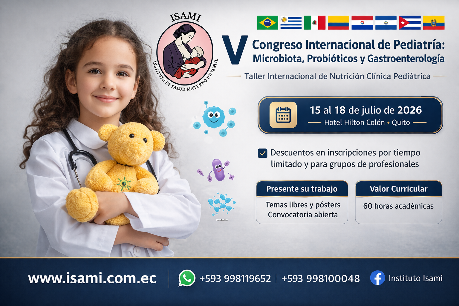 Con el firme compromiso de fomentar la formación continua de los profesionales médicos y de la salud, nos complace extenderles una cordial invitación a participar en el V Congreso Internacional de Pediatría, Microbiota, Probióticos y Gastroenterología, un evento de alto rigor académico que contará con el aval académico de la Facultad de Ciencias Médicas, de la Salud y la Vida de la Universidad Internacional del Ecuador (UIDE). El auspicio institucional del Ministerio de Salud Pública del Ecuador y la Asociación de Facultades Ecuatorianas de Ciencias Médicas y de la Salud (AFEME).