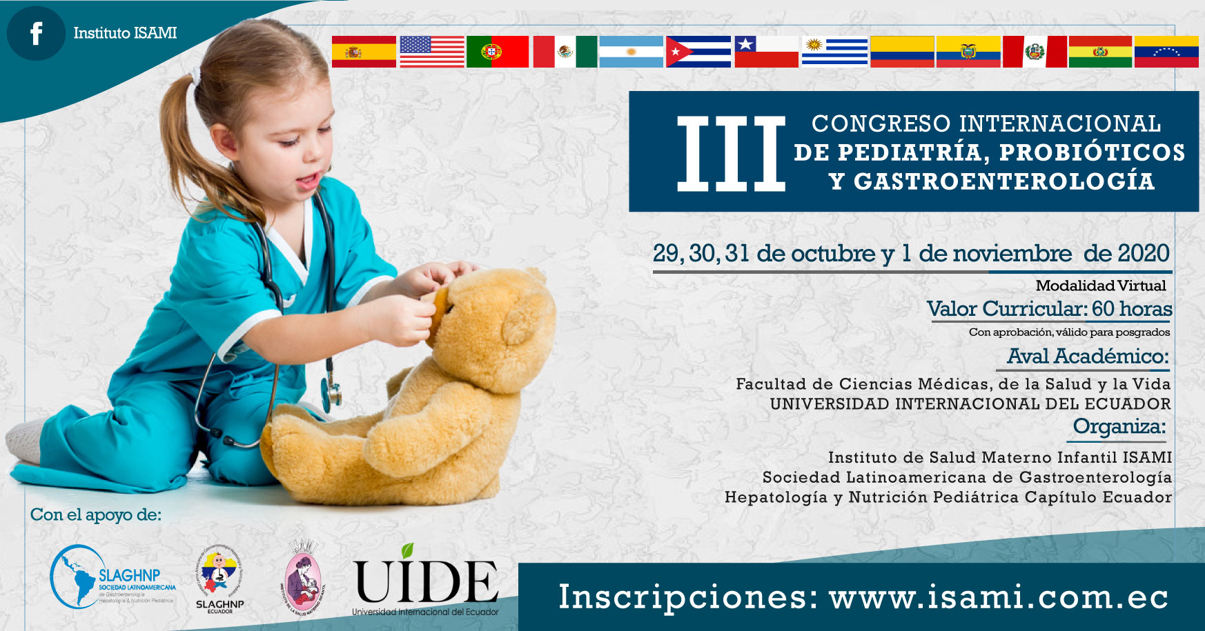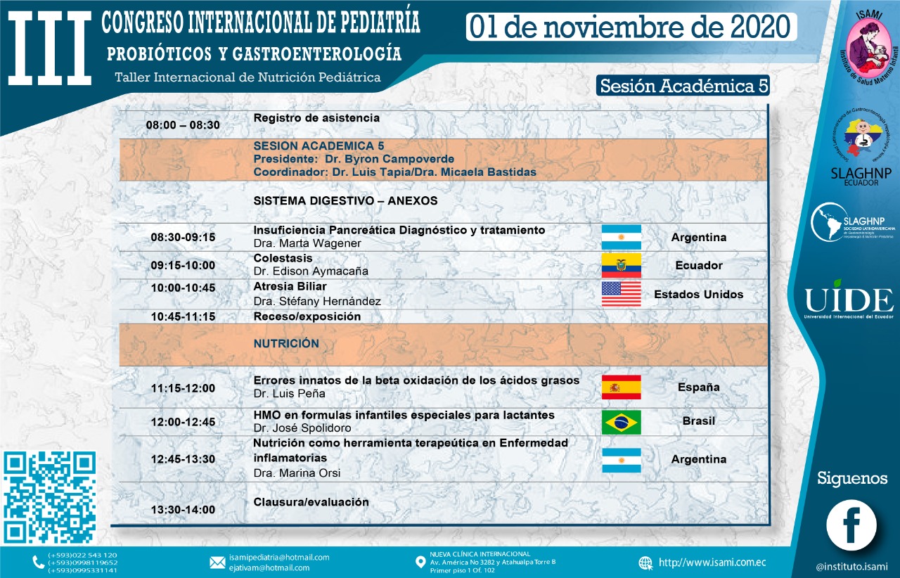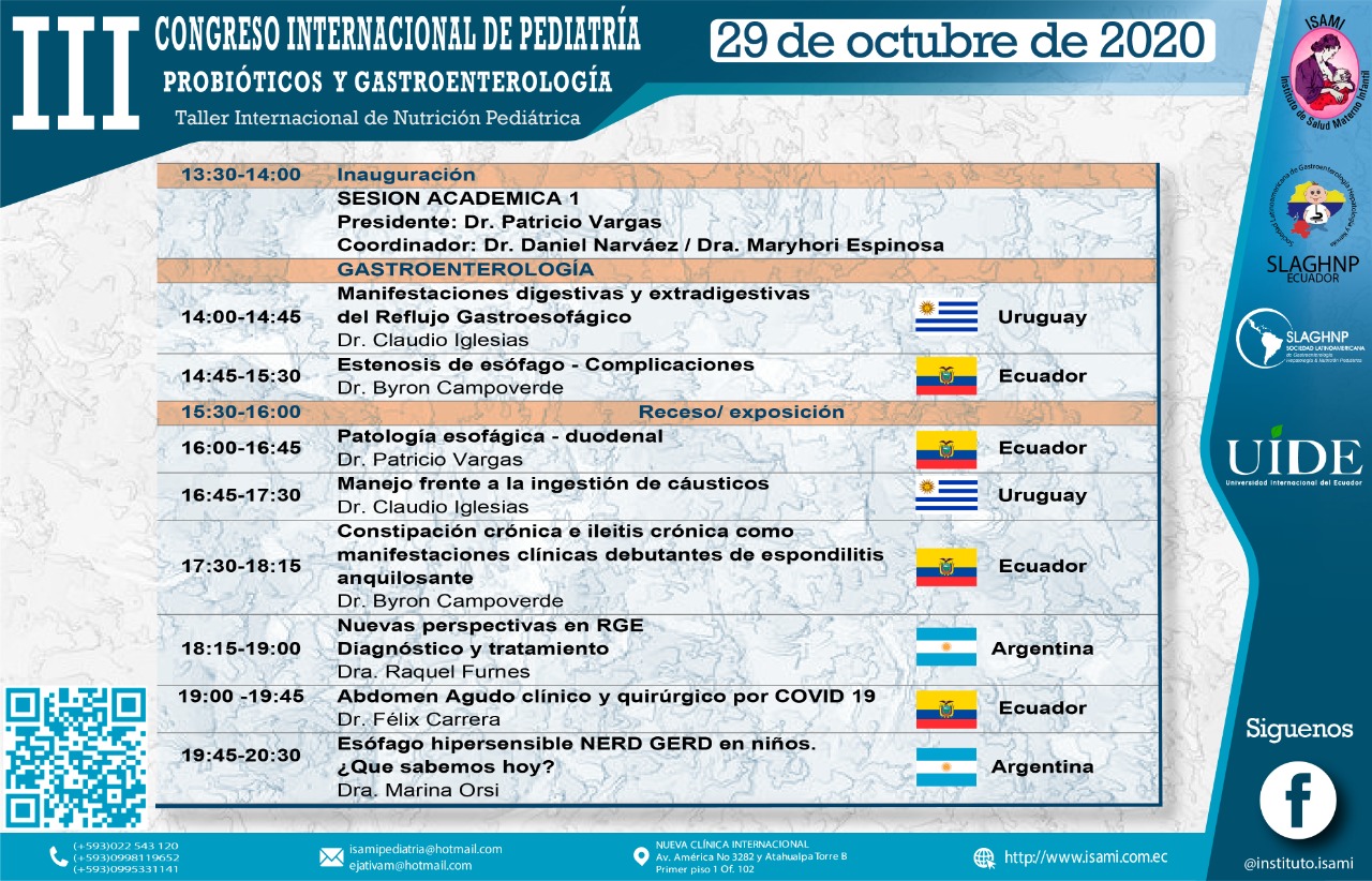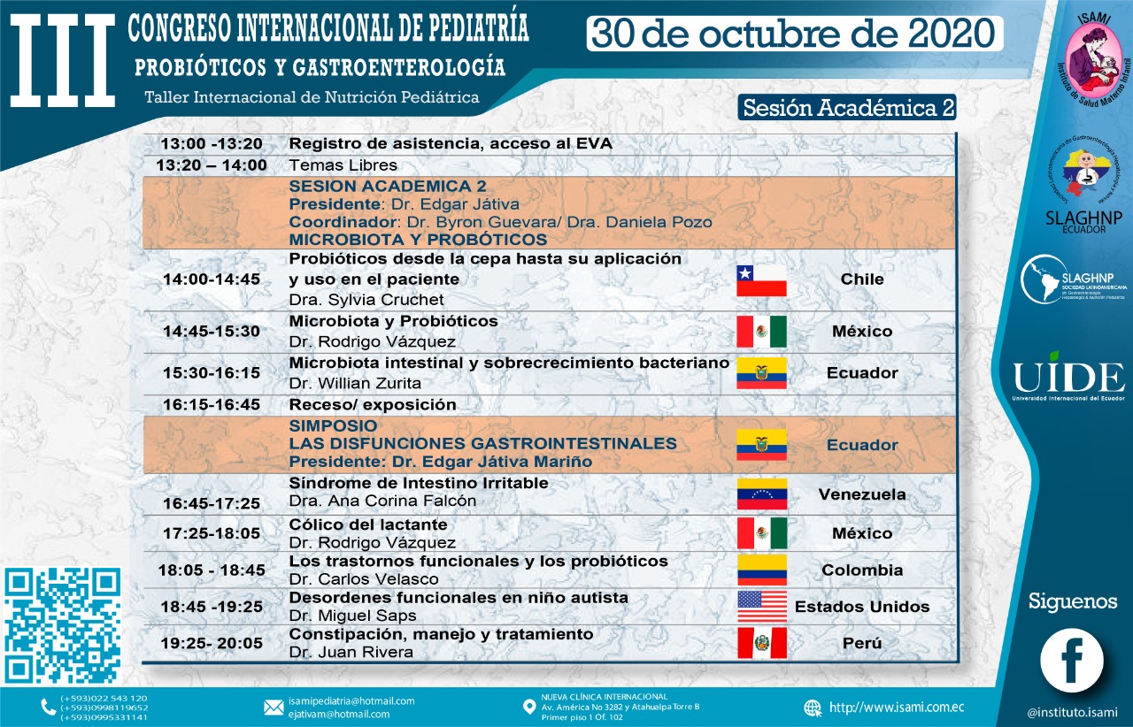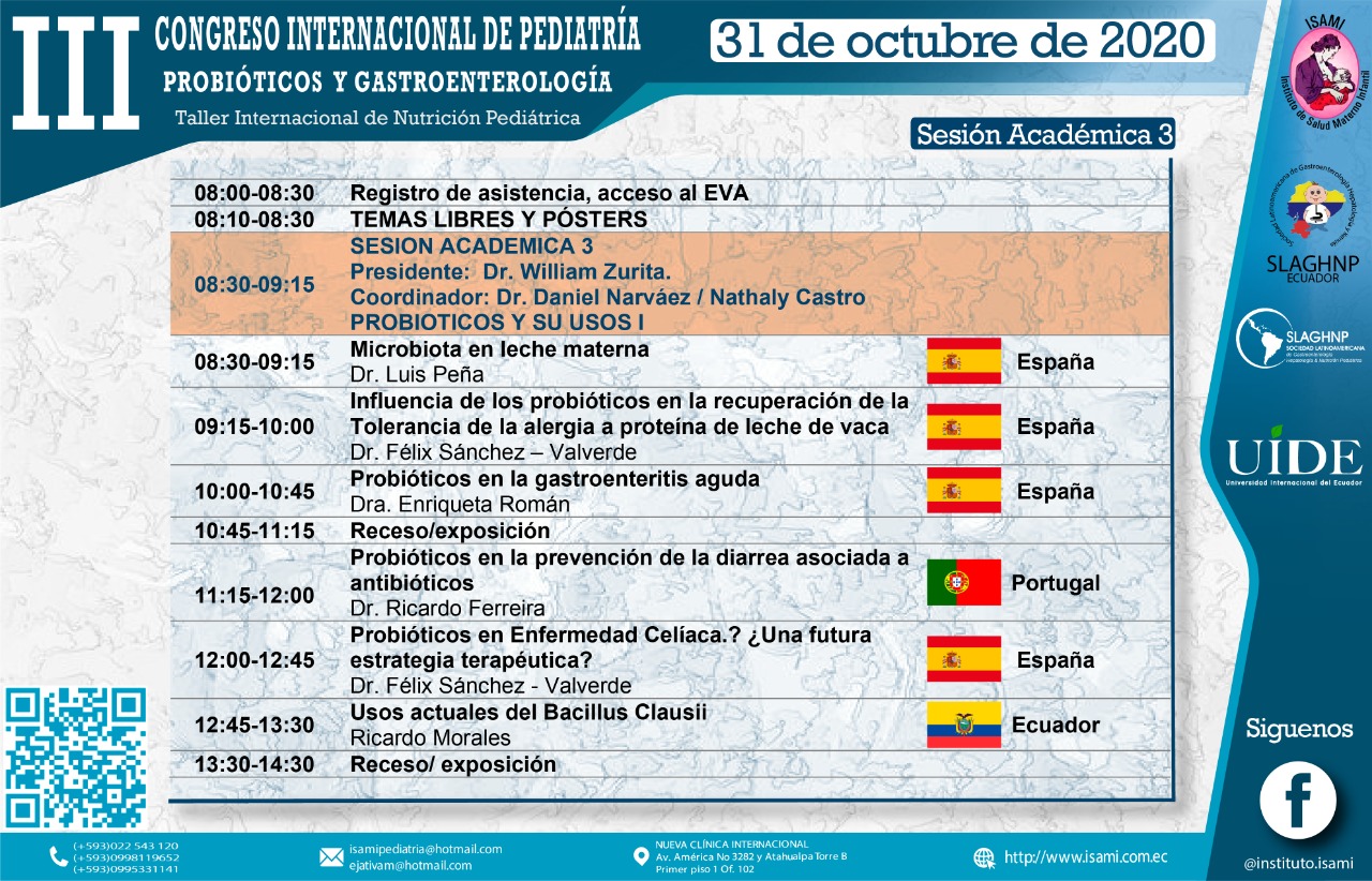 Es por ello que ponemos en vuestra consideración EL III CONGRESO INTERNACIONAL DE PEDIATRIA EN PROBIÓTICOS Y GASTROENTEROLOGÍA vía virtual, este evento tiene el aval Académico de la Facultad de Ciencias Médicas de la Universidad Internacional del Ecuador, el auspicio institucional del Ministerio de Salud Pública del Ecuador y el auspicio Internacional de la Sociedad Latinoamericana de Gastroenterología, Hepatología y Nutrición Pediátrica